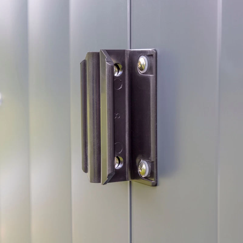 Ces panneaux qui constituent les parois et la toiture ne nécessitent aucun entretien, et leur coloris gris anthracite s’intègrera discrètement et harmonieusement dans tout type d’aménagement extérieur. L’abri dispose d’une très large double porte coulissante, qui parcourt toute la façade, très pratique pour le transport d’objets volumineux, et la porte est verrouillable (cadenas non inclus). La toiture peut supporter une charge de neige de 100kg/m², sa construction à double pente garantit une évacuation efficace de l’eau vers l’arrière de l’abri et facilite le déblayage de la neige.