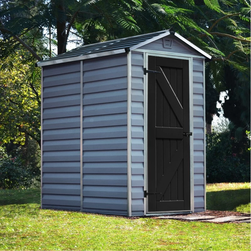 Son double toit anthracite foncé, avec une hauteur faîtière de 204cm, repose sur des panneaux latéraux gris clair de 175cm. La technologie Skylight, ce sont des panneaux opaques de l’extérieur, mais diffusant une agréable lumière naturelle à l’intérieur. Avec les deux grilles d’aération situées dans les pignons et un recouvrement de sol antidérapant empêchant l’humidité de rentrer, vous disposez d’un espace de stockage précieux. Cet abri protègera le matériel que vous y enfermerez, avec la large porte verrouillable (cadenas non inclus) possédant un seuil bas pour faciliter le passage.