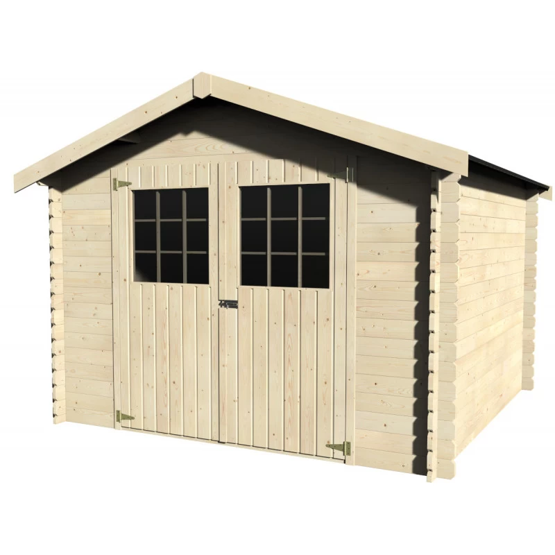 Le fabricant belge Décor et Jardin vous propose un produit de grande qualité, et au montage simple et rapide, par emboîtement des planches les unes dans les autres. Les madriers de 28mm d’épaisseur sont dotés d’un système de rainures et languettes qui rend les parois étanches et facilite encore l’installation. La toiture double pente est constituée de panneaux en aggloméré de 16 mm d’épaisseur à haute densité (630 kg/m3) pour une meilleure résistance à l’humidité. Le recouvrement initial de la toiture est du feutre bitumeux, qui pourra accueillir tout type de revêtement de toiture pour abris, tels des shingles.