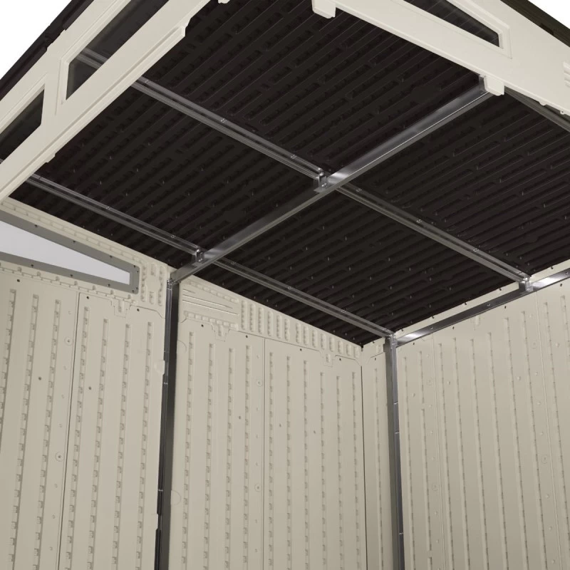 Robuste et résistant aux intempéries, l’abri de 4,88m² Modern possède des parois épaisses de 25mm avec renforts et poutres de toit en métal. Il peut supporter les vents forts jusqu’à 120km/h, ne craint ni la rouille ni le pourrissement. Le plancher de 19mm inclus renforce sa stabilité et sert d’une isolation parfaite contre l’humidité provenant du sol.