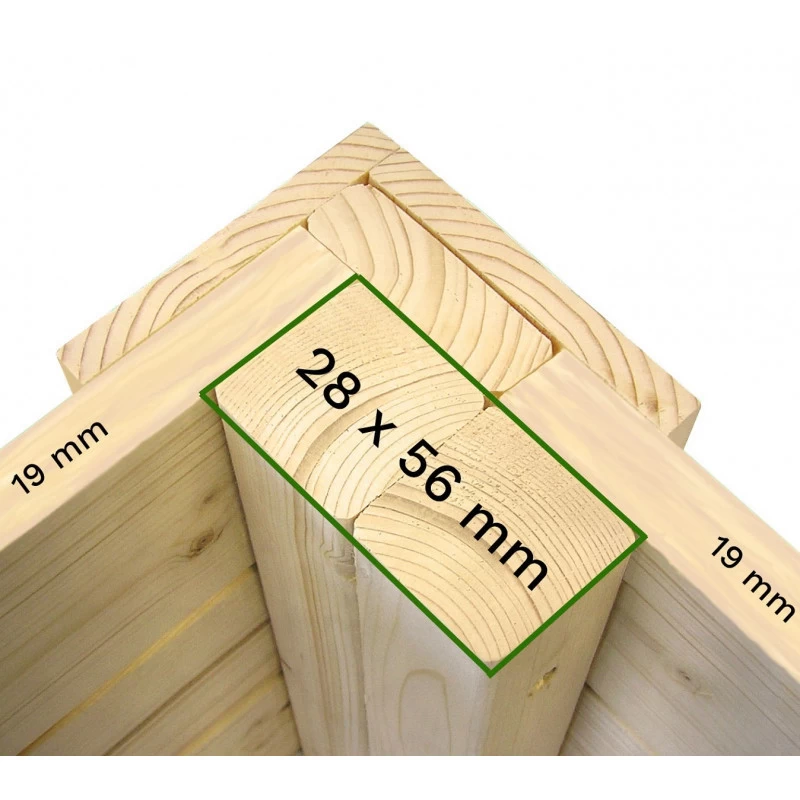 Cette armoire de jardin adossable est réalisée avec des panneaux préfabriqués en bois massif FSC de 19mm d’épaisseur. Cela rend le montage plus facile et plus rapide. Le cadre de 28mm autour des panneaux renforce la rigidité et la solidité de la structure.