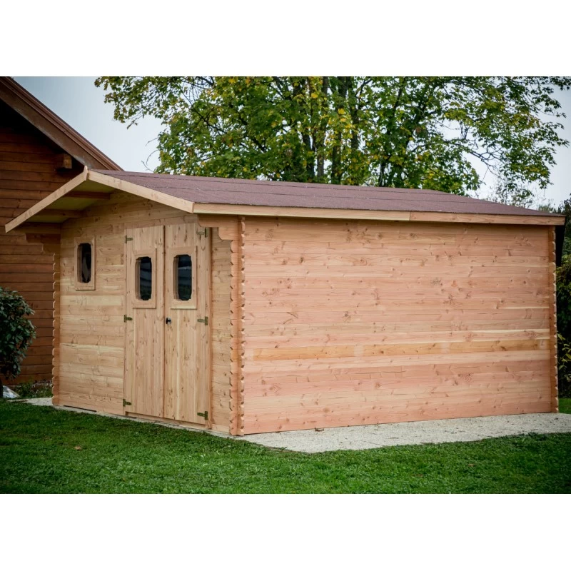 • Abri en bois de belle finition aspect brun-rosé, naturellement durable ne nécessitant pas de traitement chimique