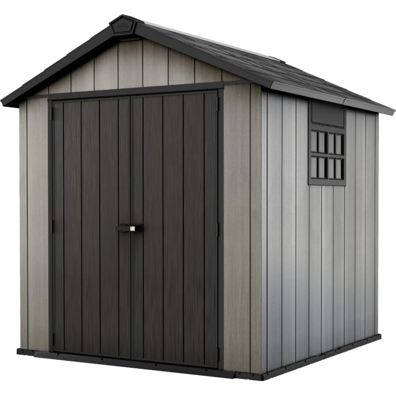 • Abri de jardin Oakland Brossium de Keter ultra-robuste en résine de polypropylène extrudée à doubles parois de 20mm d’épaisseur avec un aspect bois poncé très réaliste