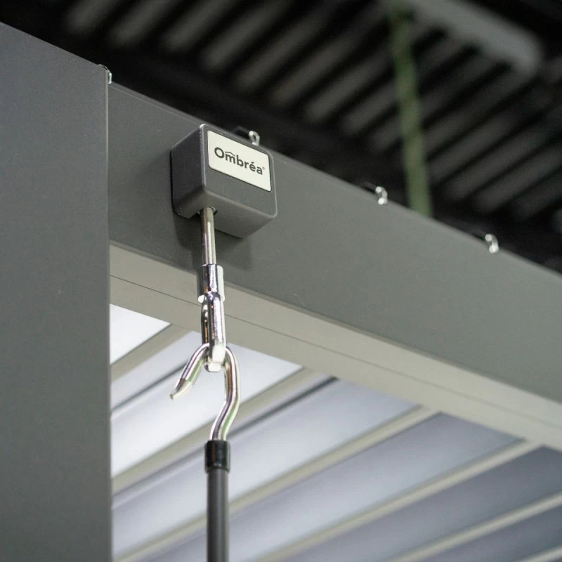 La toiture est divisée en 2 parties, chacune équipée d’une manivelle pour orienter les lames à votre convenance. Ainsi, un côté de la pergola pourra garder les lames fermées pour apporter de l’ombre à vos convives pendant que l’autre côté sera ouvert pour les amoureux du soleil !