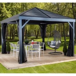 Les eaux de pluies ne posent pas un problème parce que dans les pieds de pergola adossée en alu anthracite 3×5,3m Ombrea il y a un système de drainage intégré. Vous apprécierez la belle hauteur sous le toit qui dépasse celle des produits standards sur le marché et vous donne un sentiment du confort optimal. Avec son entretien et son installation faciles, et sa garantie de 5 ans la pergola en alu anthracite 3×5.3m Ombrea est un produit de qualité qui attirera les regards de vos invités !