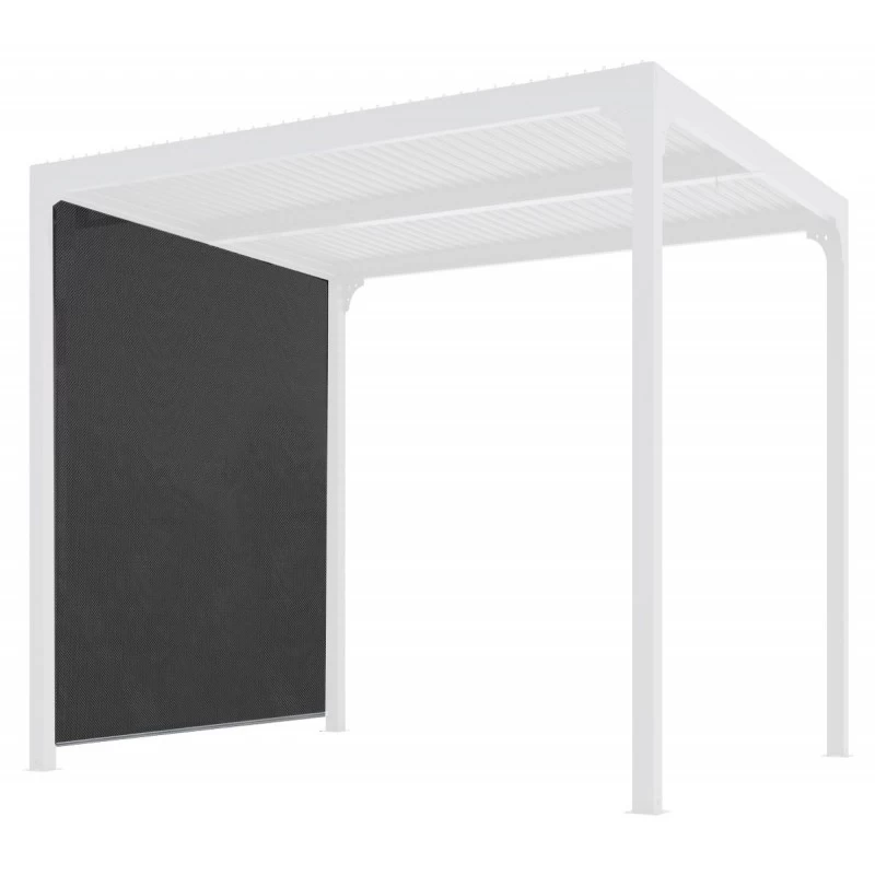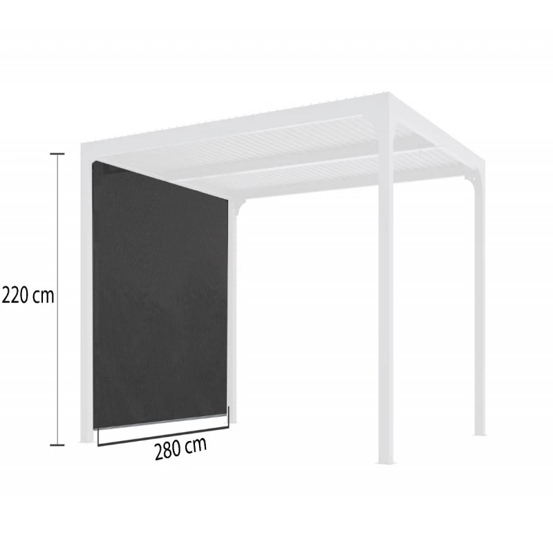 Ce rideau store est conçu spécialement et uniquement pour la façade de 3 mètres de la pergola bioclimatique en aluminium de la marque européenne Habrita, disposant d’une surface de 10,80m². Fabriqué en PVC tissé d’une excellente qualité, mesurant 280x220cm, il se déroule facilement grâce au système de guidage latéral, fixé aux poteaux de la tonnelle. Vous aurez la possibilité de choisir la hauteur, qui vous assurera une protection contre le rayonnement UV nuisible, les courants d’air indésirables et les regards indiscrets des passants ou des voisins. Le rideau coulisse verticalement sur l’un des côtés larges (selon votre choix) de la pergola bioclimatique, grâce à un système manuel simple, très bien pensé et facile à manœuvrer, qui se compose de :